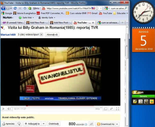 În data de 29 noiembrie 2010 am încărcat pe You Tube documentarul TVR despre vizita lui Billy Graham în România, inspirat după volumul de documente: Afacerea ”Evanghelistul” Vizita lui Billy Graham în România(1985), editat de către cercetătorii CNSAS Denisa Bodeanu și Valentin Vasile. Pe 5 decembrie 2010 0ra 02.35 la numai o săptămână de la menționarea posibilității de vizionare a documentarului pe You Tube de către blogul Istorie Evanghelică, și ulterior și de alte bloguri, documentarul a înregistrat 800 de vizualizări.