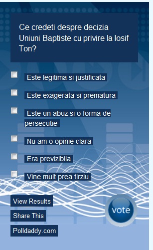 Daca doctrina dvs este una biblica, va recomand sa cititi putin mai atenti evangheliile si veti constata ca unul dintre cele mai mari pacate condamnate de Isus Hristos este ipocrizia (fatarnicia). E clar pentru toata lumea ca PAUL NEGRUT a plagiat (sunt dovezi clare in acest sesn si acesta si-a cerut scuze de la autorul pe care l-a plagiat). Tot atat de clar este ca Paul Negrut a exmatriculat mai multi studenti care s-au facut vinovati exact de acelasi pacat. Cum priveste Uniunea Baptista acest comportament? Care au fost masurile de sanctionare impotriva lui Paul Negrut? Desigur, veti spune: “Trebuie sa tinem cont cat a facut Negrut pentru bisericile baptiste”, deci prin urmare trebuie sa-i acordam circumstante atenunate. Dar cu Iosif Ton de ce nu procedati la fel? Sau dvs iubiti doar anumite parti din Scriptura, care va convin? De ce nu va sesizati atunci cand principiul biblic este incalcat in mod flagrant? Arati-ne si noua un alt rector universitar (laic) care a fost prins cu plagiatura. Paul Negrut isi permite in continuare sa sfideze legea bunului simt prin faptul ca nu recunoaste greseala pe care a comis-o in timp ce pe altii ii strange cu usa pana ii face sa recunoasca greseli mai mici. Cele semnalate mai sus sunt fapte grave, ipocrizie dovedita. Acum veti face apel la “iertare”, “ingaduinta frateasca” si altele, pt ca asa fac fariseiii religiosi. Pe altii ii taie si ii spanzura iar pe altii ii scalda in verse de ingaduinta. Duplicitatea aceasta nu este sanctionata de acesti mari iubitori ai Scritpurii? De ce oare? Pentru ei religia este mai importanta decat Cuvantul lui Dumnezeu. Paul Negrut a calcat in picioare Scritpura pe cand Iosif Ton nu a respectat intru totul oranduirea baptista…