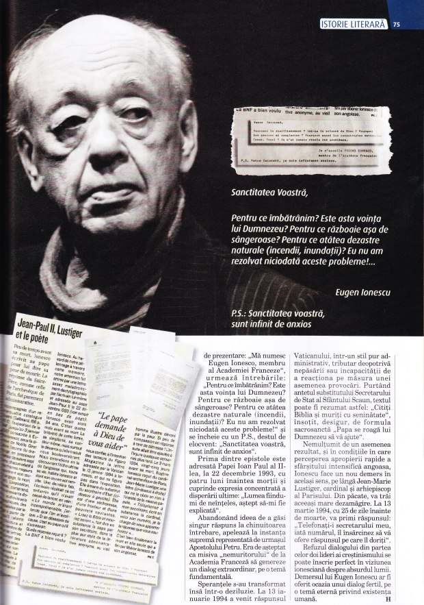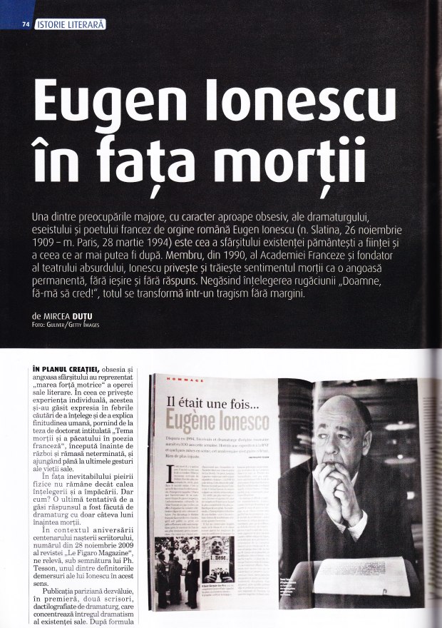 Eugen Ionescu (n. 26 noiembrie 1909, Slatina – d. 28 martie 1994, Paris) cunoscut în afara României sub numele de Eugène Ionesco, conform ortografiei franceze) a fost un scriitor de limbă franceză originar din România, protagonist al teatrului absurdului şi membru al Academiei Franceze. Obişnuia să declare că s-a născut în anul 1912, ori din pură cochetărie, ori din dorinţa de a crea o legătură între naşterea lui şi moartea marelui său precursor Ion Luca Caragiale. Mai multe detalii despre viata si cariera lui Eugen Ionescu gasiti pe Wikipedia.