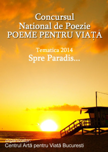 Concursul National de Poezie POEME PENTRU VIATA isi desfasoara editia 2014 in perioada 12 septembrie – 21 octombrie. In concurs se pot inscrie gratuit persoane din tara si strainatate, artisti consacrati si debutanti, cu varsta minima de 14 ani. Poeziile, 3 la numar, se trimit la adresa birouapv@yahoo.com pana in data de 21 octombrie.