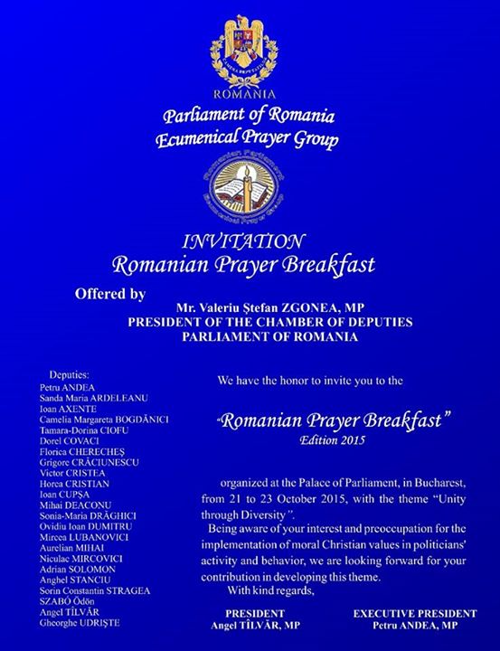 „Unitate prin Diversitate” este tema de anul acesta a acţiunii „Mic Dejun cu Rugăciune” – ediţie jubiliară, organizată în perioada 21-23 octombrie de Grupul ecumenic de rugăciune din Parlamentul României, sub Înaltul patronaj al preşedintelui Camerei Deputaţilor. La eveniment au confirmat prezenţa peste 150 de invitaţi: diplomaţi, parlamentari, reprezentanţi ai vieţii religioase, culturale şi din mediul de afaceri, atât din ţară cât şi din străinătate.