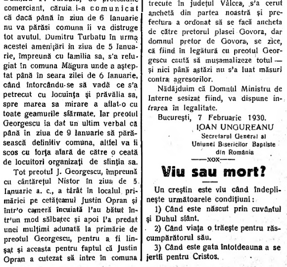 Două cazuri de persecuție religioasă ce au avut loc în anul 1930 cu toate că formal baptiștilor ca și altor confesiuni religioase li se vorbea de libertate religioasă. În acest articol sunt reproduse două cazuri de persecuție din partea unor preoți, unul ortodox și celălalt greco-catolic.