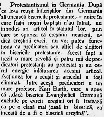 Protestul pastorilor protestanți din Germania, printre care și Karl Barth, a avut în acel context succes, dar din nefericire acțiunile împotriva evreilor, luate de statul german, au continuat.