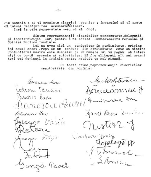 Mai jos o scrisoare deschisă semnată de lideri religioși care atrăgeau atenția asupra politicilor represive aplicate de statul român comunist.