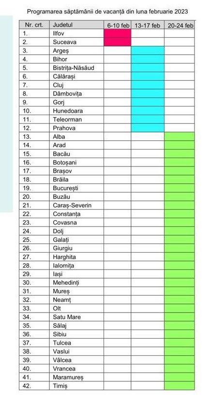 Iată și tabelul cu programarea săptămânii de vacanță din luna februarie 2023 conforma datelor Ministerului Educației preluate de edupedu