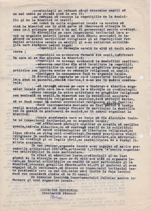 Prin intermediul acestui document doresc să prezint modul cum acționa Departamentul Cultelor în relațiile cu bisericile evanghelice. În acest caz este vorba de Biserica Creștin Baptistă din comuna Eftimie Murgu județul Caraș-Severin. Obiectul acestei informări îl constituie cumpărarea de către credincioșii baptiști a 32 de instrumente muzicale -mandoline, chitare, acordeoane-. Problema inspectorului și a organelor statului este următoarea: