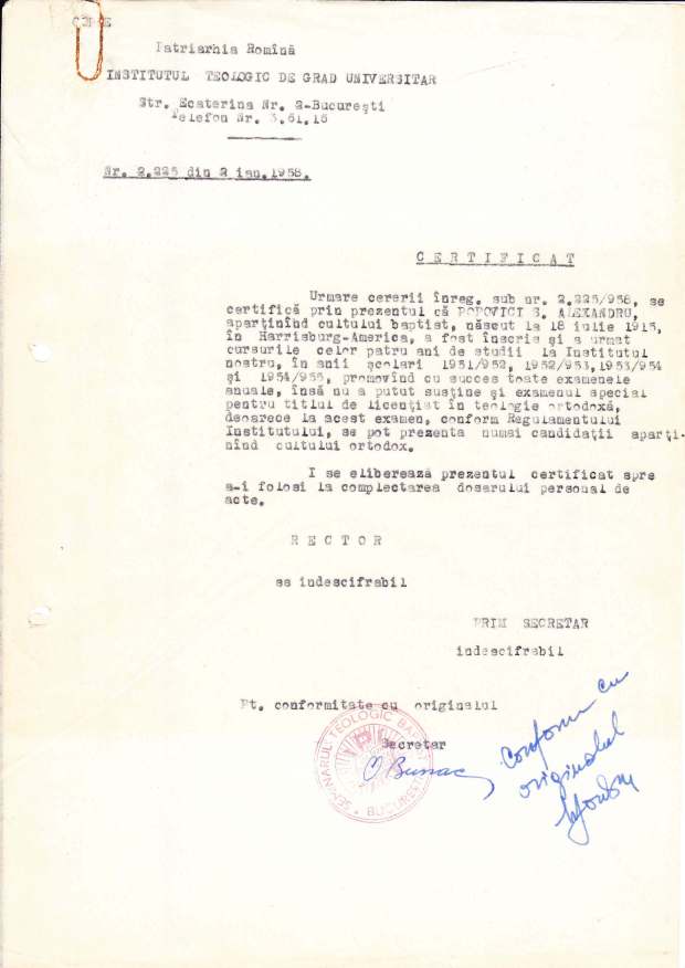 „În anul şcolar 1951–1952 au urmat cursurile Institutelor noastre Teologice şi doi pastori baptişti: Alexa Popovici şi N. Covaci. La sfârşitul anului şcolar, cei doi studenţi baptişti au adresat Înalt Prea Sfinţitului Patriarh Justinian următoarea scrisoare de mulţumire: