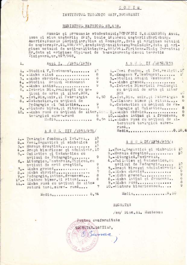 Următorul document este un extras din registrul matricol al Institutului Teologic Ortodox care prezintă situația școlară a studentului Popovici S. Alexandru pe parcursul celor patru ani de studii. Conform foii matricole, cea mai mică medie generală în cadrul anilor de studii a fost 8.18, fiind înregistrată la sfârșitul anului II de studii, iar cea mai mare 9.30 la finalul anului IV. Mediile generale aferente celor patru ani de studii teologice, precum și media generală 8.58, dovedesc faptul că Alexa Popovici s-a aflat printre cei mai buni studenți ai Institutului Teologic Ortodox din București