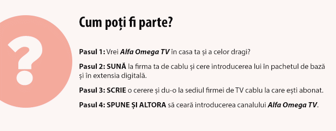 Inteleg ca includerea Alfa Omega TV si Credo TV in lista „must carry” nu inseamna neaparat ca operatorii de cablu le vor si include obligatoriu in grila lor de programe. Prin urmare este nevoie sa solicitam includerea lor in grila de programe standard sau sa migram catre firmele care ofera aceste canale in grila standard.