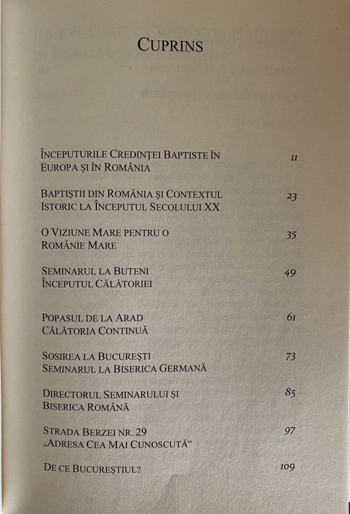 Bogat ilustrată cu imagini relevante și inedite lucrarea prezintă informații despre începuturile Seminarului Baptist la Buteni în anul 1921 și „călătoria” spre București, Capitala țării.