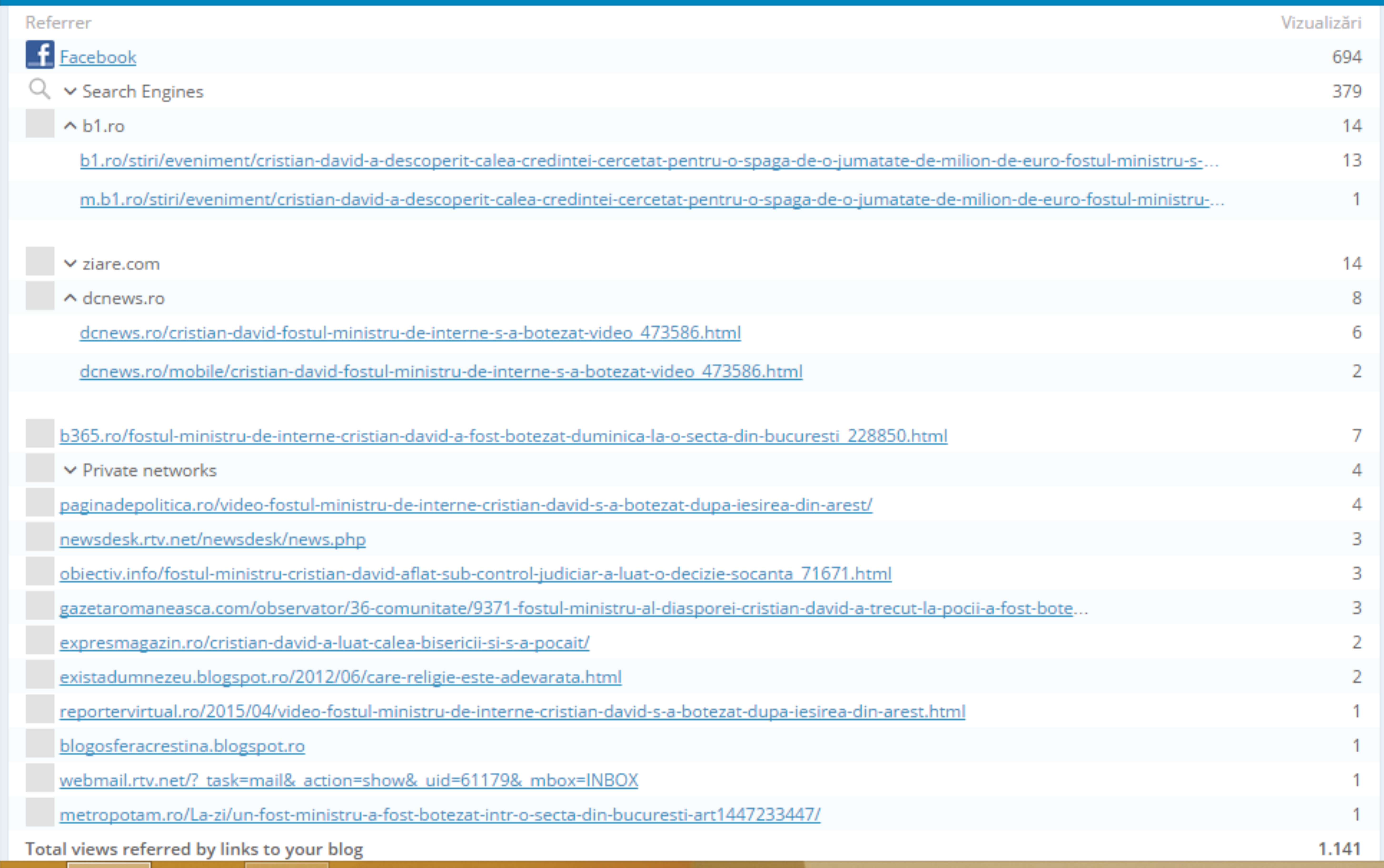Articolul despre botezul domnului Cristian David intitulat „Fostul Ministru de Interne, Cristian David, s-a botezat la Biserica Internațională Harul din București” ocupă poziția 8 în Top 100 WordPress (23:17). Până la această oră articolul are peste1500 de accesări.
