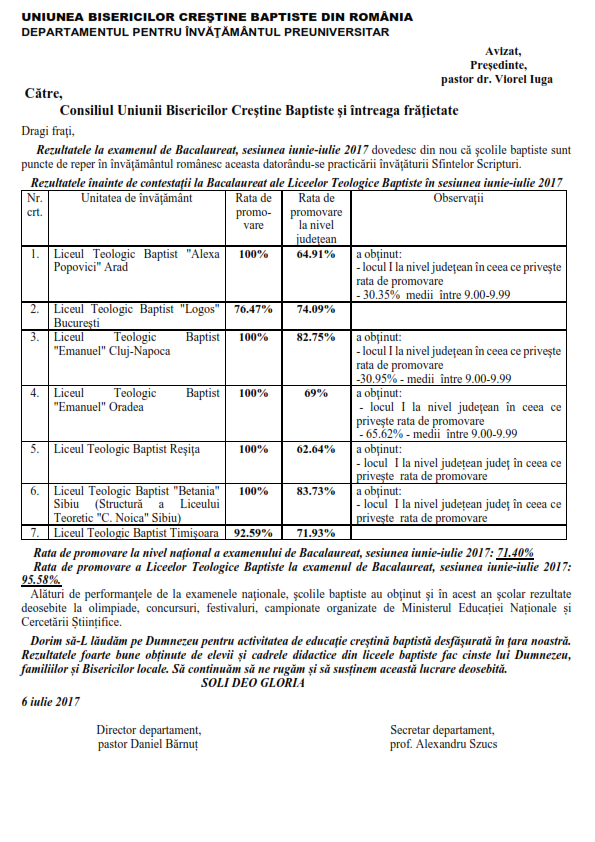 UBR : Comunicat al Departamentului de învățământ preuniversitar privind rezultatele la examenul de bacalaureat 2017 pentru liceele teologice baptiste