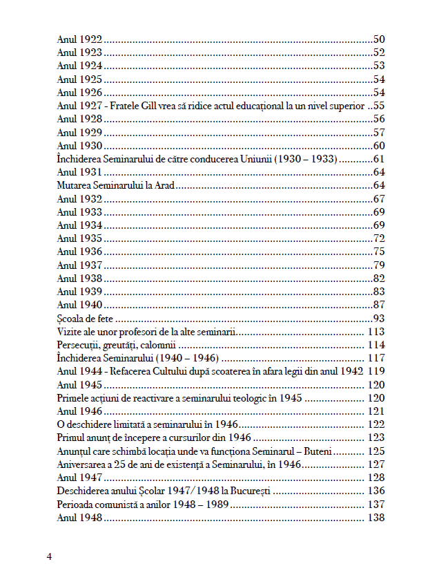 Cea mai importantă secțiunea este cea a capitolului IV Seminarul Teologic Baptist din România 1921-2021, care este și cel mai consistent dat fiind faptul că are aproape 200 de pagini (pp. 22-211). Aici se regăsesc informații interesante, importante și inedite din și despre istoria Seminarului. Evenimentele sunt prezentate cronologic, autorii alocând câte un subcapitol pentru aproape fiecare an din perioadele în care instituția a funcționat.