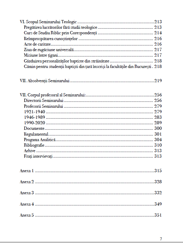 Doresc să remarc aici încă un element de noutate, dar totodată și munca autorilor, aceea de a cuprinde în cadrul unor tabele, care se regăsesc în cadrul capitolului VII Absolvenții Seminarului, 56 de tabele cu cele LVI de promoții ale Seminarului Teologic Baptist și apoi Institutului Teologic Baptist din București învățământ de zi, dar și liste cu promoțiile de absolvenți ai programului de FR (Frcvență Redusă) și ai celui de ID (Învățământ la Distanță). La ID lipsesc informații pentru perioada 2008-2010.