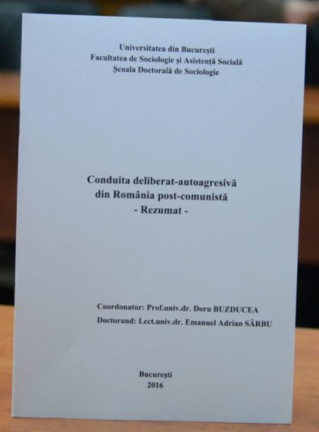 Prietenul meu, Lect. univ. dr. Emanuel Adrian Sârbu, a susținut astăzi public în cadrul Facultății de Sociologie și Asistență Socială, Universitatea din București, teza de doctorat cu titlul: Conduita deliberat- autoagresivă din România post – comunistă.