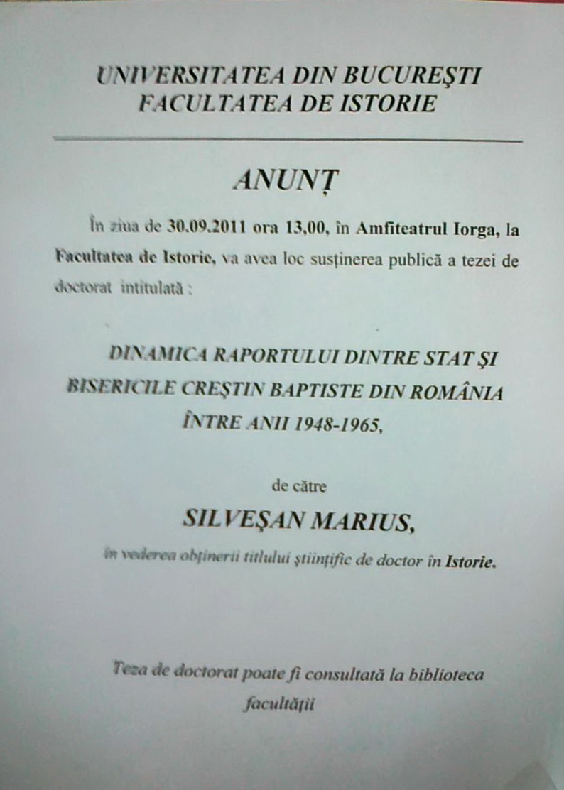 Titlul pe care l-am pus acestui articol reprezintă într-o anumită măsură sinteza cercetărilor mele din ultimii trei ani de zile, care se finalizează acum prin susținerea publică în data de vineri, 30 septembrie 2011, a tezei de doctorat intitulată Dinamica raporturilor dintre Stat și Bisericile Creștine Baptiste din România între anii 1948-1965. Activitatea de cercetare a fost coordonată de către reputatul istoric Dinu C. Giurescu. Evenimentul va avea loc cel mai probabil în sala de consiliu a Facultății de Istorie din cadrul Universității București. Pentru cei interesați de acest aspect al istoriei recente atașez rezumatul tezei, care poate fi downloadat apăsând AICI. În cadrul cercetării și apoi pe parcursul redactării m-am bazat cu precădere pe sursele arhivistice în cea mai mare parte inedite. Subiectul, de asemenea, reprezintă o noutate pentru spațiul istoriografic românesc. Din cunoștințele mele nu știu să mai existe o altă lucrare care să abordeze în exclusivitate relația dintre Bisericile Creștine Baptiste și statul român între 1948-1965. Dacă ne referim la Alexa Popovici și Ioan Bunaciu putem menționa că aceștia nu și-au propus o astfel de abordare și nici nu au întrebuințat surse arhivistice. O serie de cercetări recente și-au propus să investigheze istoria comunităților evanghelice sub comunism, fiind abordate cu precădere subiecte care privesc o anumită latură a relației Biserică-Stat, respectiv aspectul colaboraționismului. Lucrări de certă valoare științifică au realizat Dorin Dobrincu, Denisa Bodeanu, Vasilică Croitor, Gheorghe Modoran.