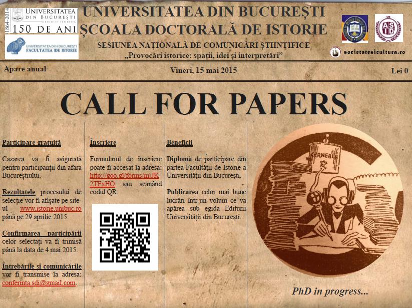 Școala Doctorală de Istorie din cadrul Facultății de Istorie a Universității din București organizează pe data de 15 mai 2015 Conferința Naţională de Comunicări Știinţifice Provocări istorice: spaţii, idei și interpretări. Evenimentul se adresează studenților-doctoranzi la istorie și științe conexe, din toți anii de studiu și din toate centrele universitare din țară.