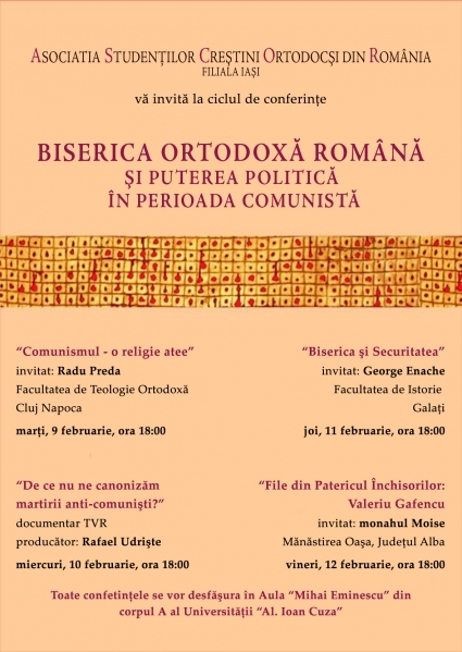 Rugăciunile unora dintre voi au fost ascultate, motiv pentru care săptămâna aceasta va aşteptăm la ciclul de conferinţe având ca temă „Biserica Ortodoxă Română şi puterea politică în perioada comunistă” . Astfel, marţi 9 februarie, începând cu ora 18:00, va avea loc conferinţa „Comunismul –o religie atee” avându-l ca invitat pe Lect. Univ. Dr. Radu Preda, lector la Facultatea de Teologie Ortodoxă a Universităţii „Babeş-Bolyai“ din Cluj, director fondator al Institutului Român de Studii Interortodoxe, Interconfesionale şi Interreligioase (INTER). Domnul Preda este de asemenea membru al Comitetului redacţional al revistei „Renaşterea“, publicaţie oficială a Arhiepiscopiei Ortodoxe Române a Vadului, Feleacului şi Clujului şi membru în staff-ul Forumului European al Facultăţilor de Teologie Ortodoxă (Bruxelles). Miercuri 10 februarie, începând cu ora 18:00, se va proiecta documentarul, „De ce nu canonizăm martirii anti – comunişti?” – o producţie TVR semnată de Rafael Udrişte. Cea de a doua conferinţă va avea loc joi, 11 februarie de la ora 18.00. Titlul conferinţei va fi „Biserica şi Securitatea”, avându-l ca invitat pe Lect. Univ. Dr. George Enache, membru CNSAS şi lector la Facultatea de Istorie din Galaţi Cea de a treia conferinţă „File din Patericul Închisorilor: Valeriu Gafencu” va avea loc vineri, 12 februarie de la ora 18.00. Conferenţiar va fi Monahul Moise, de la Mănăstirea Oaşa, judeţul Alba. Toate conferinţele se vor desfăşura în Aula „Mihai Eminescu” din corpul A al Universităţii „Al. I. Cuza” – Iaşi. La fiecare conferinţă veţi putea cumpăra cărţi ale invitaţilor la preţuri studenţeşti. Manuela Cluci |