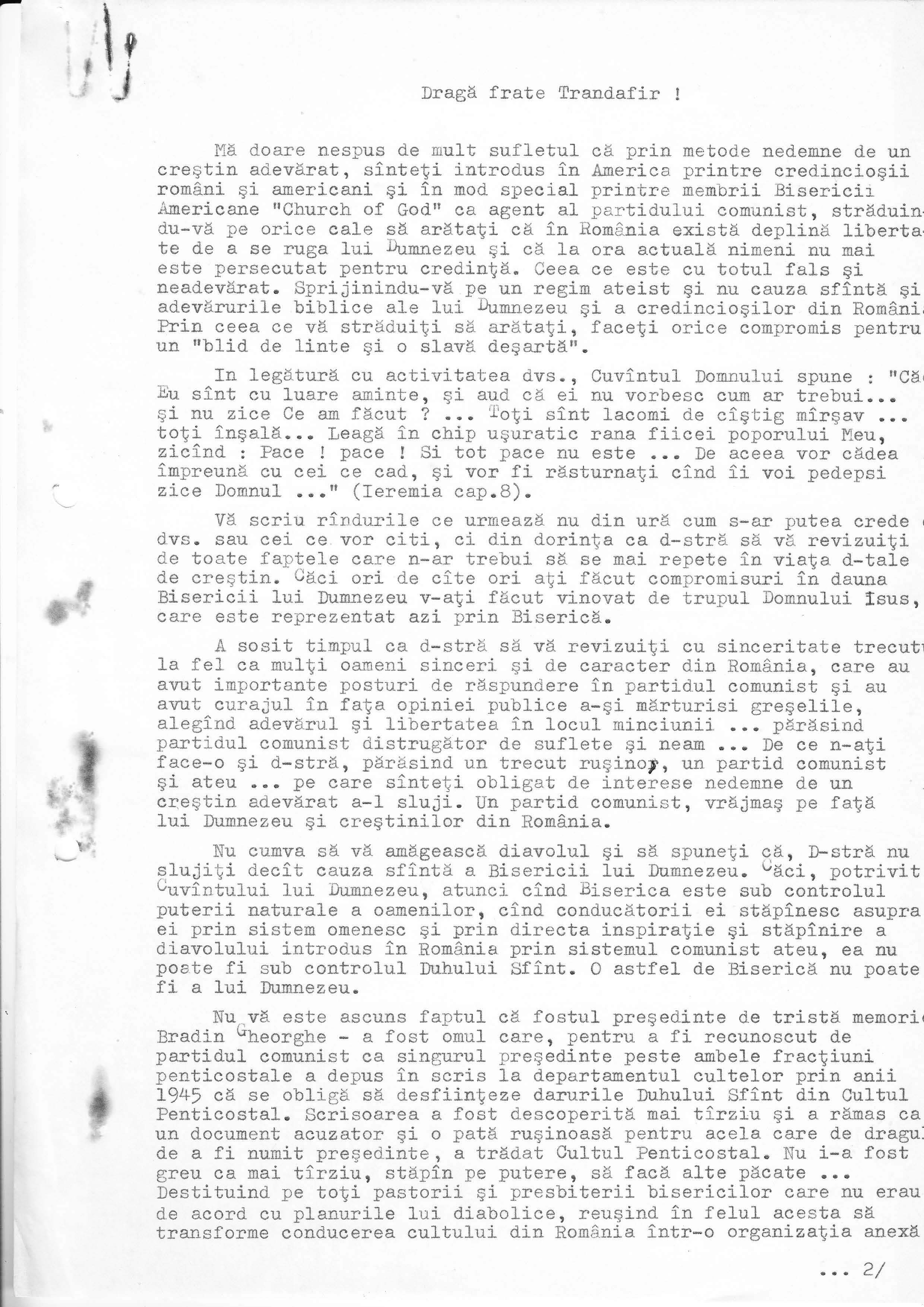 Istoria cultului penticostal, ca și a celorlalte culte evanghelice din perioada comunistă, este adeseori complicată iar uneori ambiguă. Iubirea de patrie era o expresie frecventă în discursurile oficialilor comuniști, fiind utilizată și de unii lideri evanghelici precum Sandru Trandafir, director al Seminarului Teologic Penticostal din București începând cu anul 1976 pentru a-și dovedi loialitatea față de autorități. Posibil să mă înșel, dar acestea sunt concluziile notei prin care Sandru Trandafir, în calitate de director al Institutului Teologic Penticostal din București, înaintează Departamentului Cultelor o scrisoare primită de la Răscol Victor. Scrisoarea deschisă difuzată în străinătate a fost redactată în opinia lui Sandru Trandafir cu scopul ,,de a defăima atât țara noastră, cât și pe mine personal.”