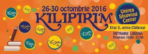 „O ofertă impresionantă de cărți la prețuri „de kilipir”, peste 7.500 de titluri, îi așteaptă pe cititori la ediția din această toamnă a celui mai important târg de carte cu discount, Kilipirim. Volume pentru copii și tineret, dar și pentru cititorii experimentați, deopotrivă beletristică, nonficțiune și albume de artă – acestea sunt produsele care compun oferta expozanților, pe parcursul celor 5 zile de târg (29 oct.-2 nov., zilnic între orele 10.00 și 22.00), la Unirea Shopping Center – et. 2, Aripa Călărași.”