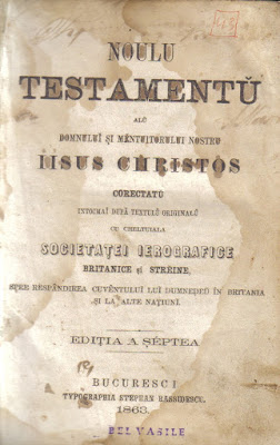 Este vorba de Noul Testament tipărit la București prin Typographia Stephan Rassidescu în anul 1863 adus de către Anton Novak angajat de către Societatea Biblică Britanică.