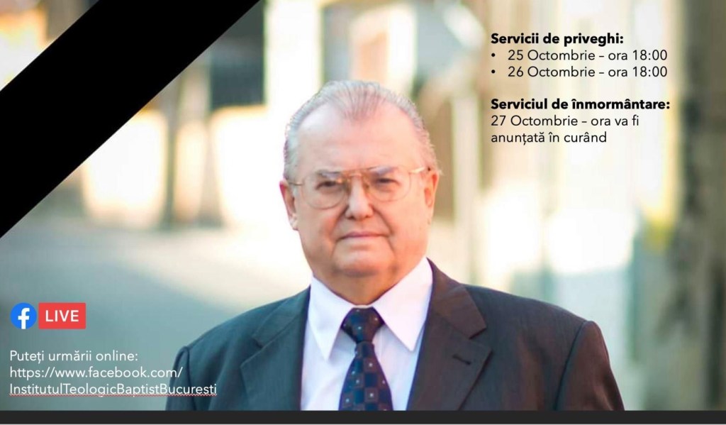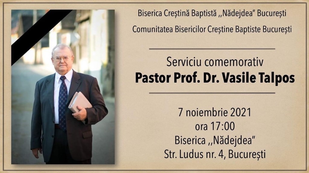 Luni si marti, de la ora 18:00, în cadrul Bisericii Creștine Baptiste „Betania” din Sibiu, se vor desfasura slujbele comemorative de priveghi cu ocazia plecarii la Domnul a fratelui Vasile Talpos. Sluba de înmormântare va avea loc miercuri, 27 octombrie 2021, în aceeasi locatie, la o oră care va fi comunicată ulterior. De asemenea, unii dintre cei care au fost influențați de slujirea fratelui Talpoș vor avea scurte cuvântări, via Zoom, în cadrul celor doua seri comemorative de priveghi și a serviciului de înmormântare de miercuri. Cei care vor fi prezenți la înmormântarea de miercuri, vor transmite mesajul în mod fizic la fața locului. Dumnezeu să mângâie familia îndoliată și să-Și culeagă Slava și cu ocazia acestor evenimente !